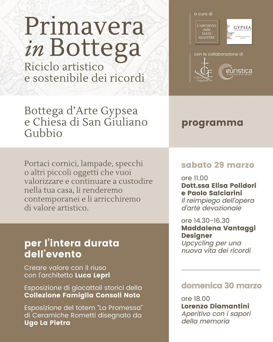 In parallelo, il 29 e 30 marzo, Gubbio ospita l’iniziativa “Primavera in bottega”, a cura dell’Archivio delle Mani Maestre e Gypsea Bottega d’Arte, in collaborazione con la Diocesi e La Medusa. Tra la bottega Gypsea e la chiesa di San Giuliano, l’evento propone esposizioni e laboratori creativi sul riuso artistico, valorizzando memoria e sostenibilità. Oggetti del passato acquisiscono nuova vita, intrecciando arte, storia e impegno. Esposizioni, laboratori creativi di upcycling (riutilizzo creativo, appunto), percorsi guidati tra arte, storia e gusto, per esplorare insieme come il patrimonio culturale e manuale possa dialogare con il presente nel segno dell’impegno. Il programma si aprirà sabato 29 marzo con una riflessione sul valore dell’arte devozionale e sul suo possibile reimpiego. Alle ore 11, Elisa Polidori e Paolo Salciarini accompagneranno il pubblico in un viaggio tra sacro e contemporaneo, mostrando come gli oggetti di culto possano mantenere intatta la loro carica simbolica anche in un nuovo contesto.