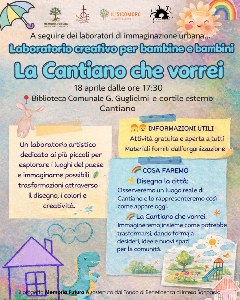 Un pomeriggio all’insegna della fantasia, della condivisione e della scoperta del territorio attende anche le bambine e i bambini di Cantiano. Sempre sabato 18 aprile, a partire dalle ore 17:30, la Biblioteca “Guglielmi” e il suo cortile esterno ospiteranno il laboratorio creativo intitolato “La Cantiano che vorrei”, un’iniziativa pensata per coinvolgere i più piccoli in un percorso artistico e partecipativo.