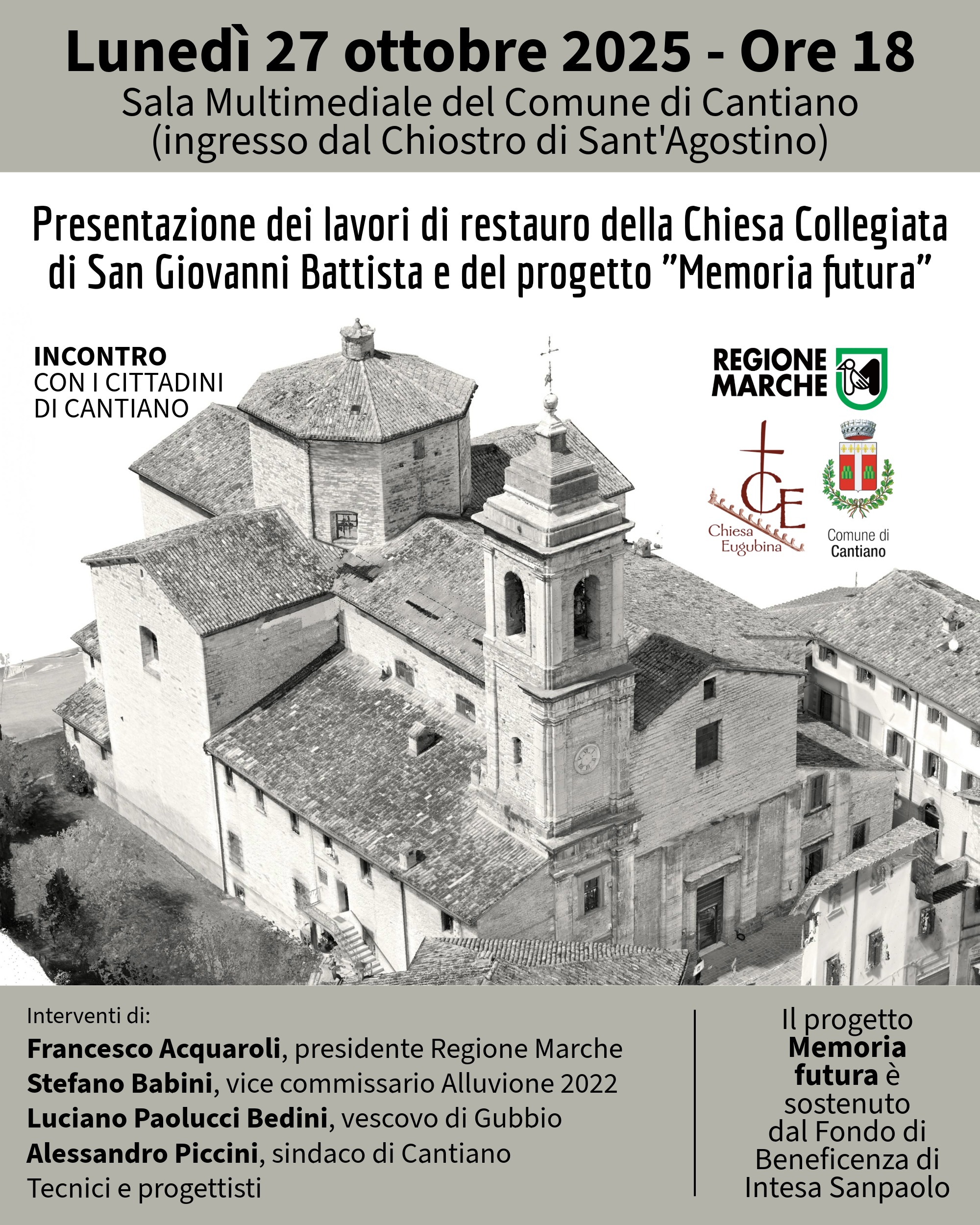Lunedì 27 ottobre 2025, alle ore 18, la Sala multimediale del Comune di Cantiano (ingresso dal chiostro di Sant’Agostino) ospiterà un incontro pubblico dedicato alla presentazione dei lavori di restauro della chiesa collegiata di San Giovanni Battista e del progetto “Memoria futura”.