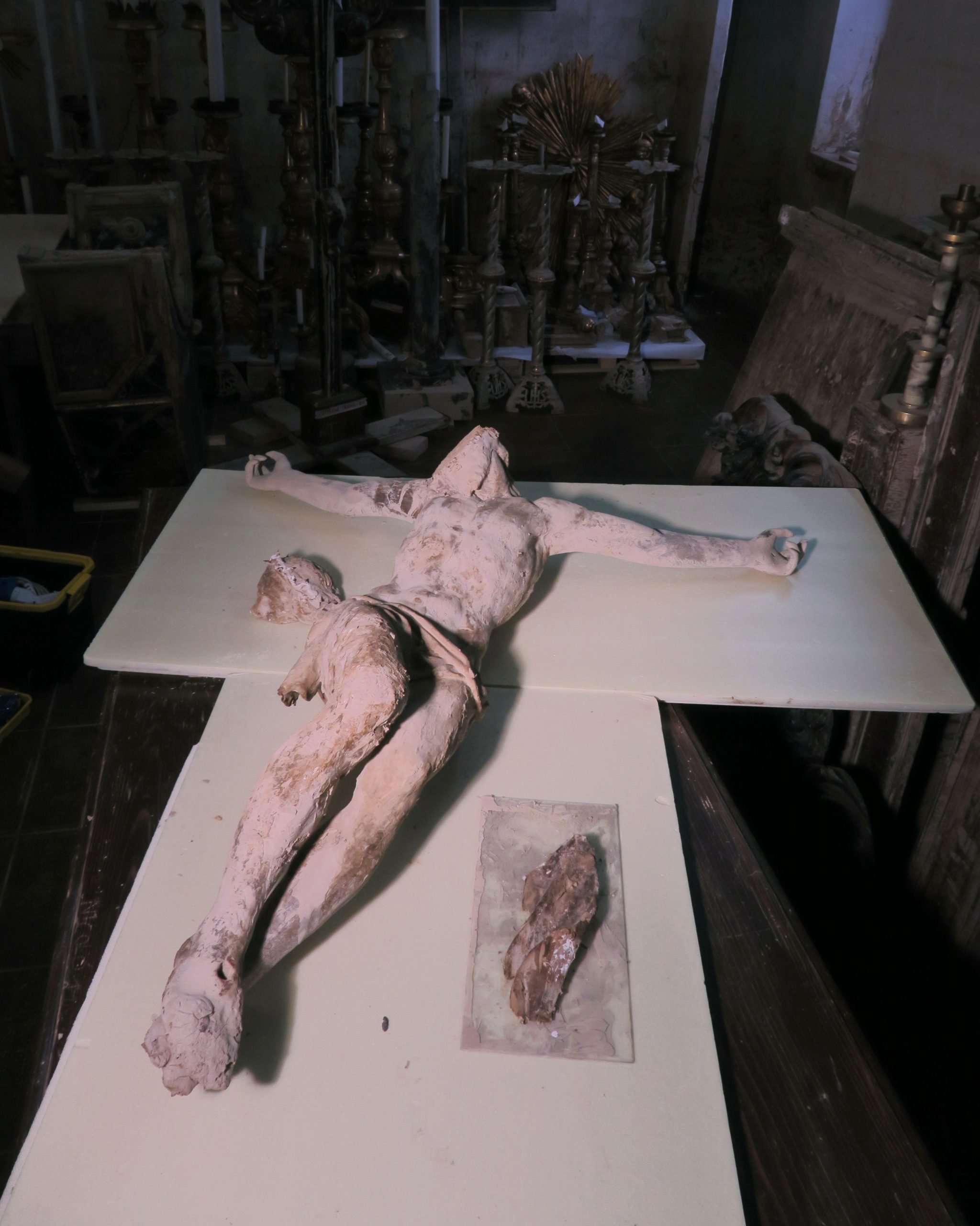 Tra gli oggetti in queste gravi condizioni, il personale dell’Istituto centrale per il restauro ha notato un crocifisso ligneo di pregevole fattura che, durante l’evento, era stato sommerso da fango, detriti e sostanze contaminanti, subendo un danno significativo sia a livello strutturale sia estetico; l’Istituto, come di consueto, ha quindi proposto di farsi carico dell’intervento di restauro nell’ambito dei corsi della propria Scuola di alta formazione e studio. L’Icr, infatti, appoggia e alimenta lo spirito di partecipazione che i propri studenti manifestano in queste circostanze.