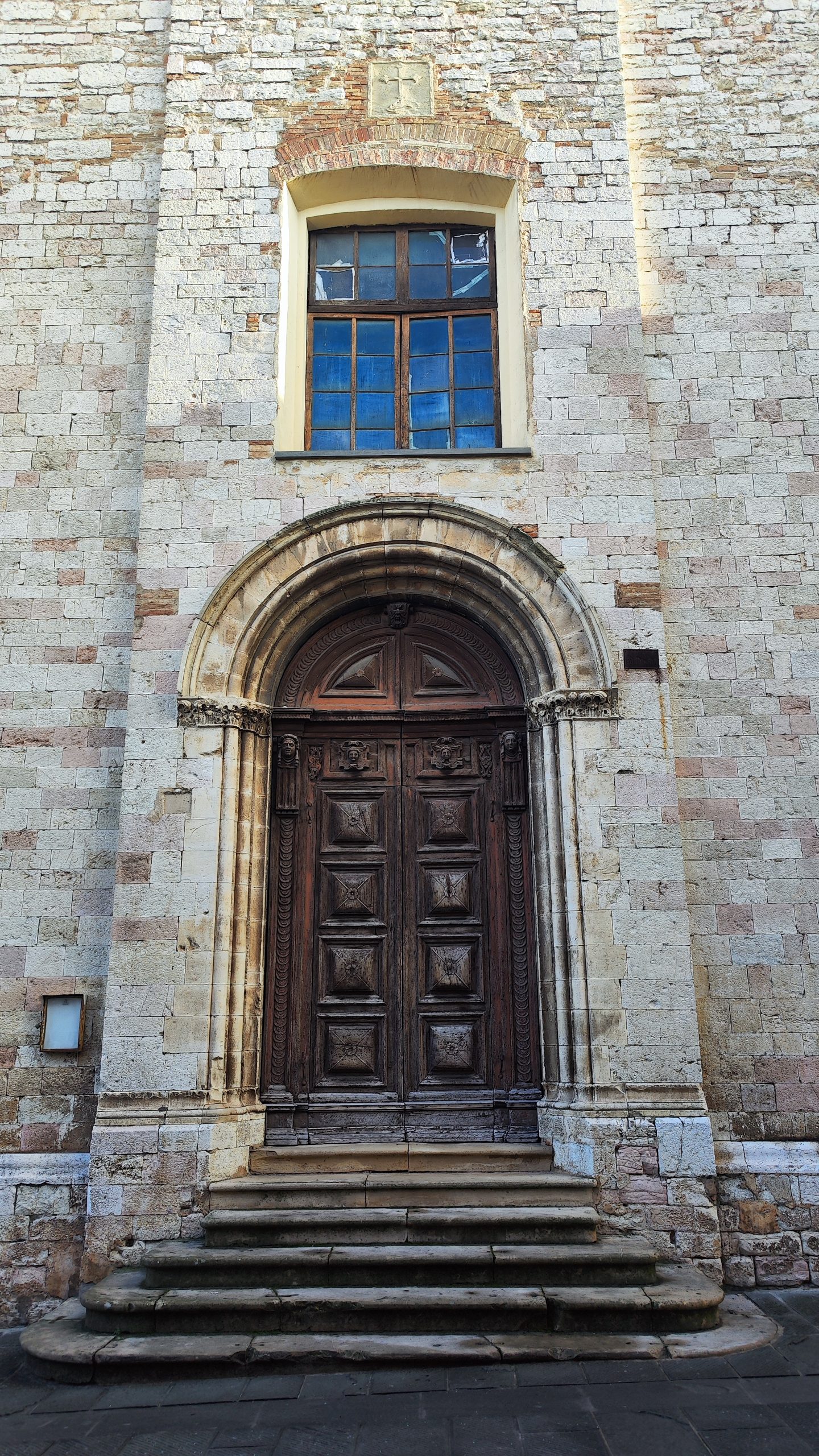 Elemento di particolare pregio è il portale in pietra ad arco a tutto sesto, risalente al XIII secolo, impreziosito da colonne e capitelli scolpiti a motivi floreali, unico resto dell’antica chiesa dei Disciplinati di Sant’Agostino. La parte superiore della facciata, invece, risale al XV secolo, rendendo immediatamente leggibile la duplice fase costruttiva dell’edificio.