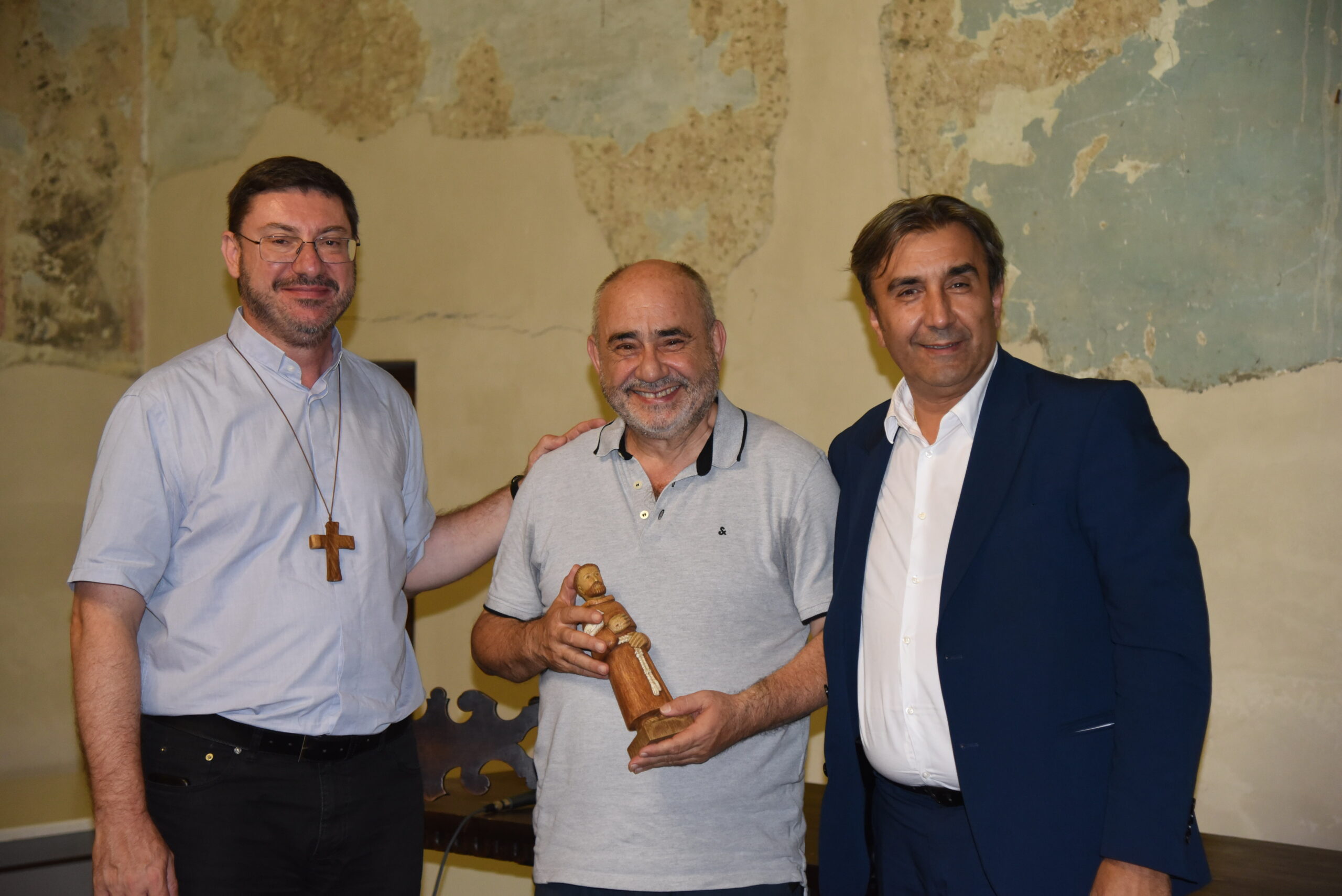 - Il vescovo Luciano Paolucci Bedini e il sindaco Vittorio Fiorucci con don Tonio Dell’Olio, alla consegna del Premio “Lupo di Gubbio” per la riconciliazione 2024