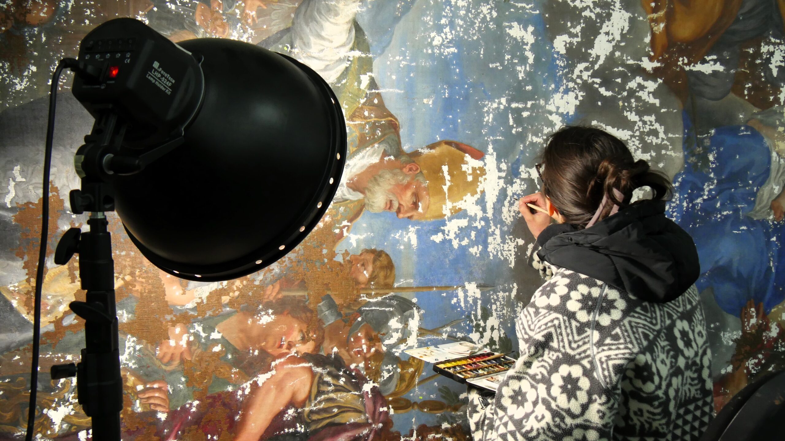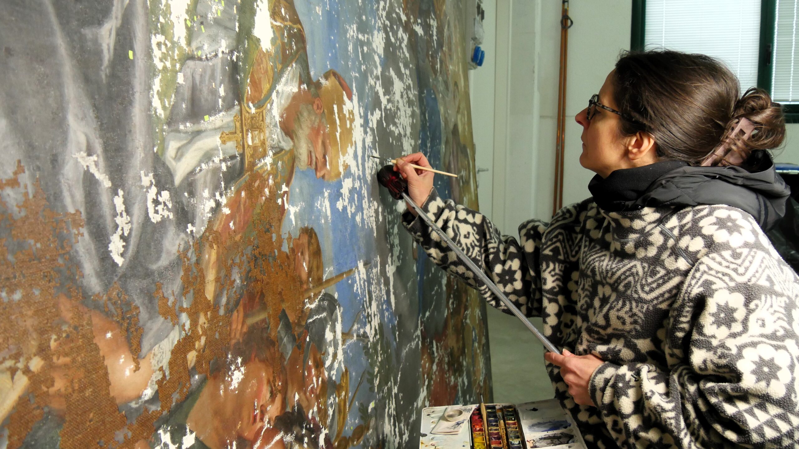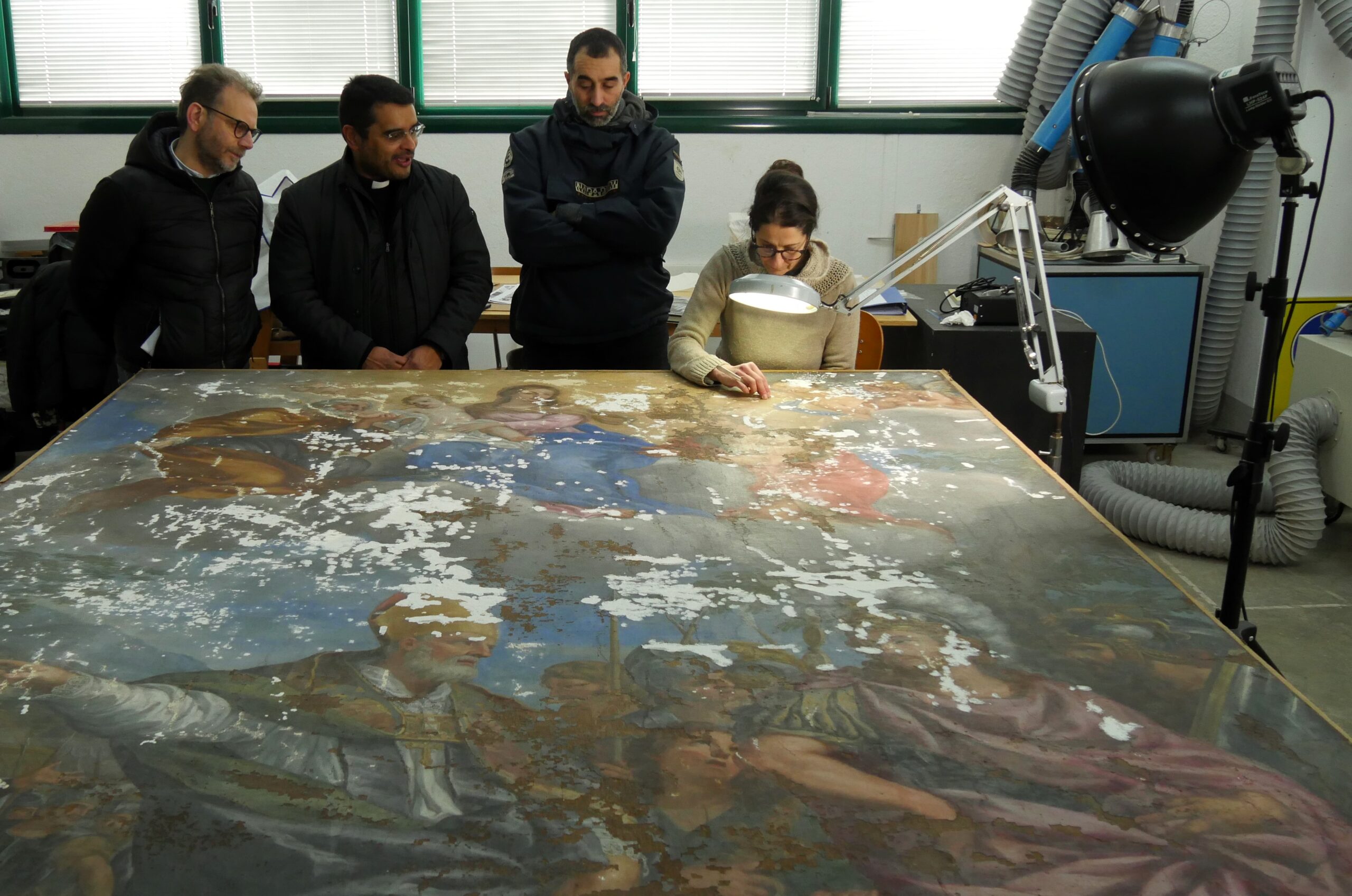 - Alcuni momenti del restauro della tela del Ferri con sant’Ubaldo e il Barbarossa