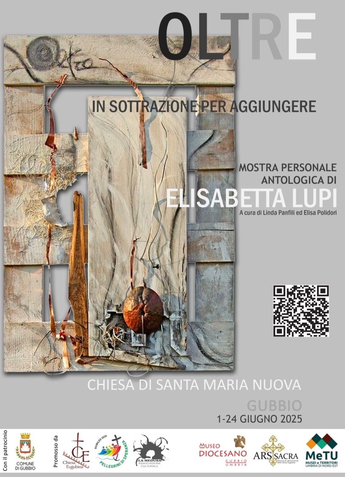 “Oltre – In sottrazione per aggiungere” è il titolo della mostra personale di Elisabetta Lupi, inaugurata il primo giugno presso la chiesa di Santa Maria Nuova, a cura di Linda Panfili ed Elisa Polidori. L’esposizione, realizzata sotto l’egida della Diocesi di Gubbio e nel circuito del Polo museale diocesano, si inserisce nelle celebrazioni del Giubileo ordinario della Speranza ed è il primo vero momento antologico dell’artista gualdese, che presenta una selezione di opere realizzate in oltre venticinque anni di ricerca e sperimentazione.