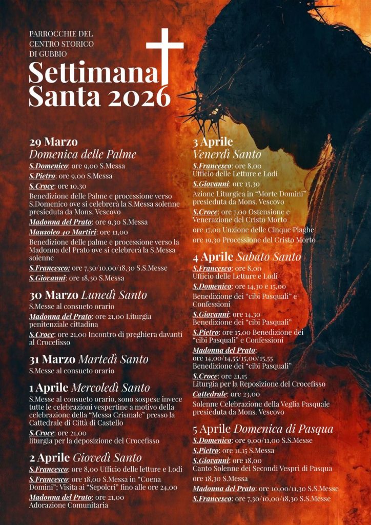 Il giorno seguente, Venerdì Santo, 3 aprile, sarà dedicato alla memoria della Passione del Signore: alle ore 15, nella chiesa di San Giovanni a Gubbio, il vescovo presiederà l’azione liturgica della Passione, mentre alle ore 19 le vie della città faranno da cornice alla tradizionale e suggestiva Processione del Cristo morto.
