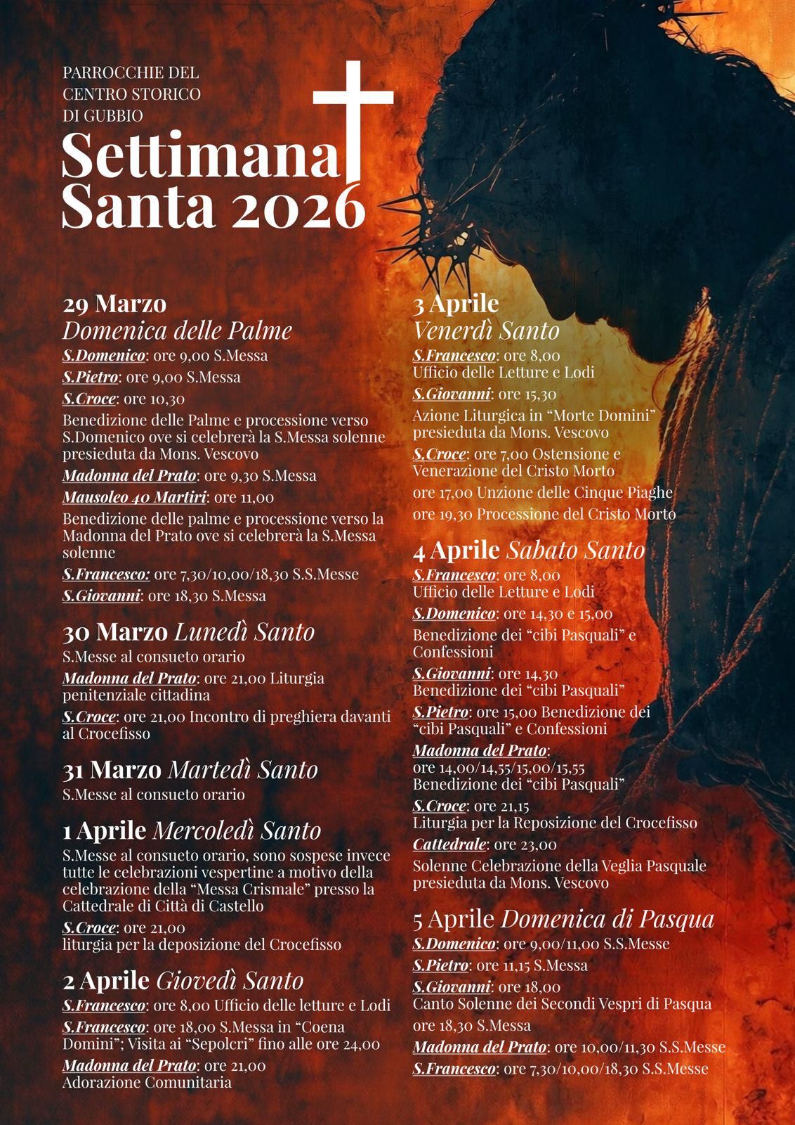 Le Chiese diocesane di Gubbio e di Città di Castello si preparano a vivere i giorni più intensi e significativi dell’anno liturgico, cuore pulsante della fede cristiana: la Settimana Santa. Un tempo sacro, denso di memoria e di simboli, che conduce i fedeli attraverso il mistero della Passione, Morte e Risurrezione di Cristo, fino alla luce gioiosa della Pasqua.