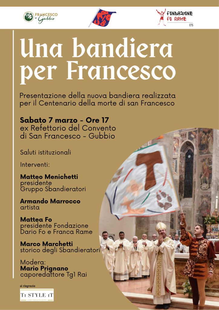 Sabato 7 marzo alle ore 17, nell’ex Refettorio del Convento di San Francesco a Gubbio, si terrà la tavola rotonda dal titolo “Una bandiera per Francesco”, un momento di approfondimento culturale inserito nel calendario di iniziative dedicate al Centenario francescano. L’incontro metterà in dialogo arte contemporanea, tradizione storica e memoria della città, a partire dalla presentazione della nuova bandiera dedicata a san Francesco e al suo legame con Gubbio.