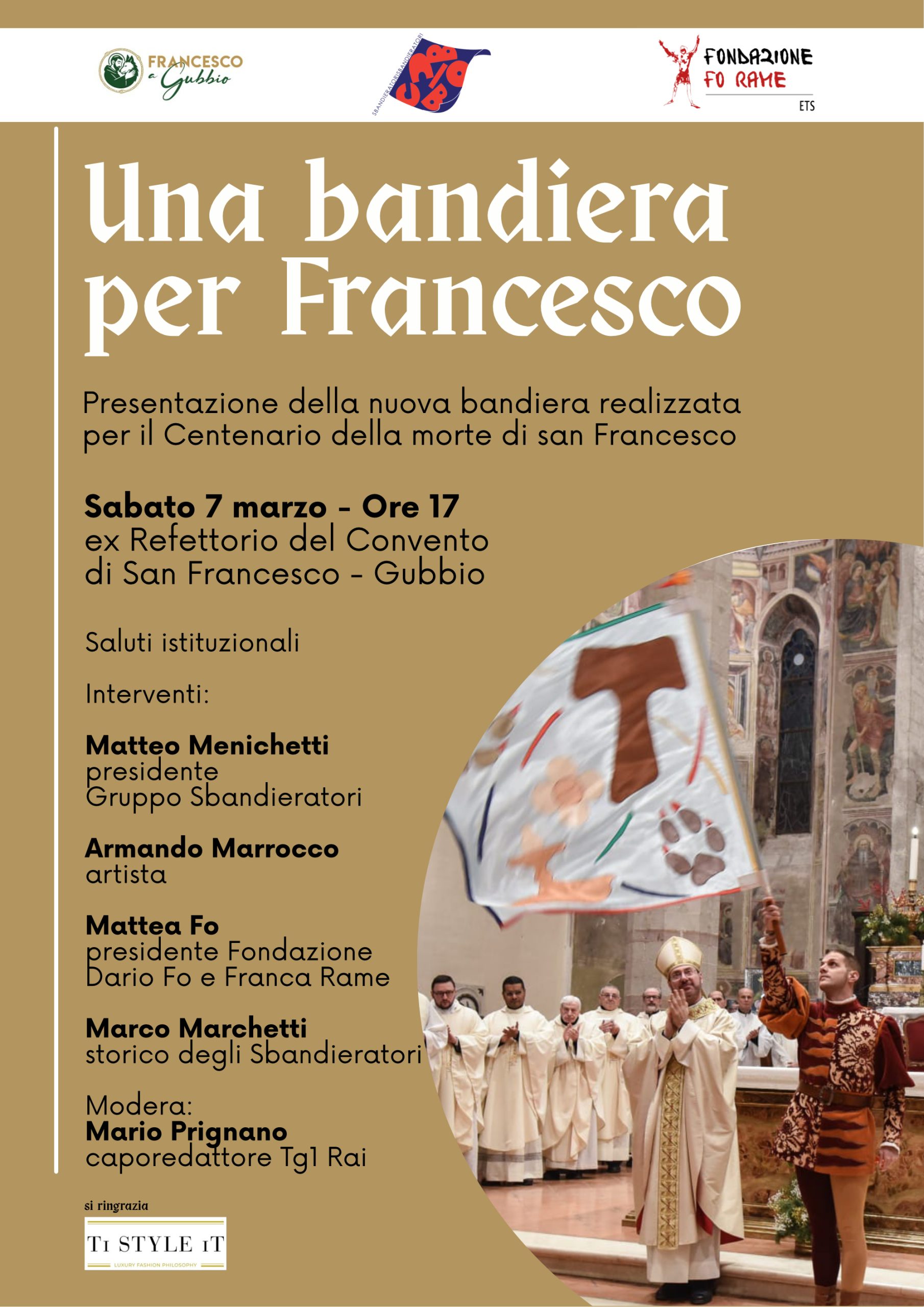 L’appuntamento è promosso dal comitato Francesco a Gubbio, dal Gruppo Sbandieratori di Gubbio e dalla Fondazione Dario Fo e Franca Rame ETS, realtà che collaborano per valorizzare la tradizione eugubina degli Sbandieratori e il patrimonio culturale e spirituale legato alla figura del Poverello di Assisi. Il programma prevede i saluti istituzionali e una serie di interventi che accompagneranno il pubblico alla scoperta del significato e della genesi della nuova bandiera.